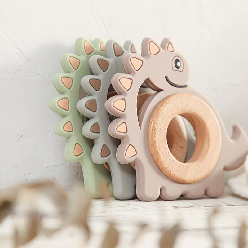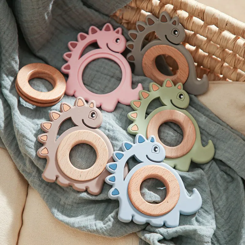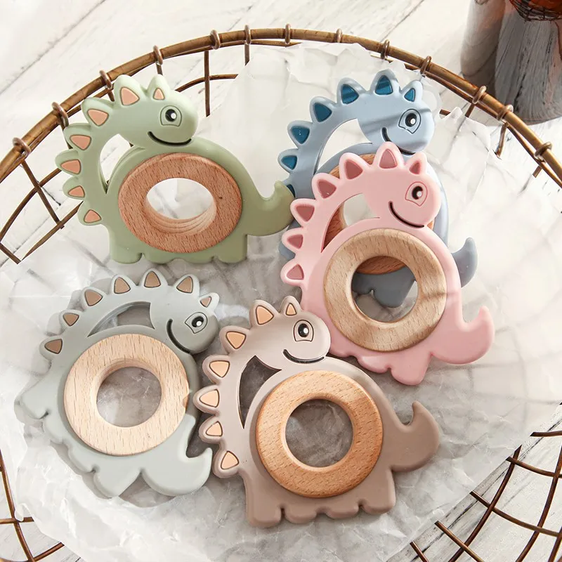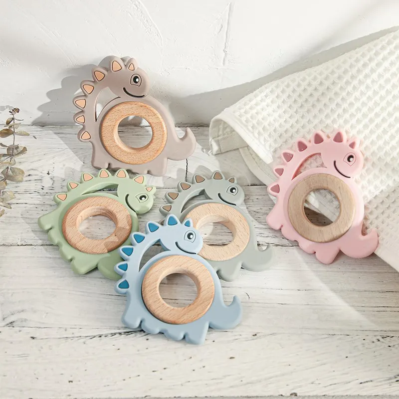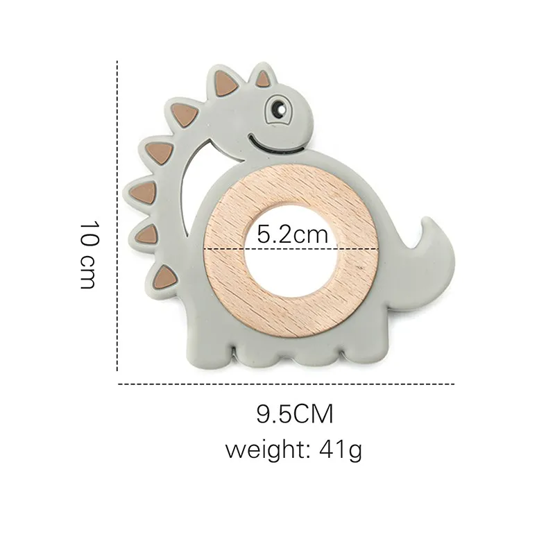1Pcs Baby Toys Teether Cartoon Dinosaur Animal Wood Rings Food Grade Wooden Teething Silicone Rings Nursing Gift Infants Tooth